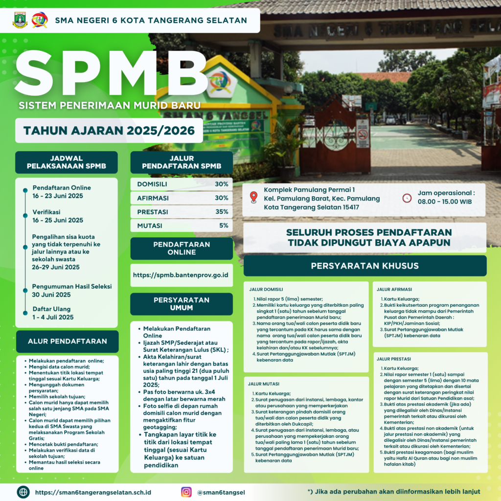 Link Pengisian Biodata Calon Murid Baru Tahun Pelajaran 2025/20261. Jalur Domisili : https://forms.gle/Haw3E98enhE6LRh662. Jalur Afirmasi : https://forms.gle/J6kt2LapSG1u5oTP63. Jalur Mutasi : https://forms.gle/4ebkp1RqCgwrhvut74. Jalur Prestasi Akademik : https://forms.gle/HxYyLMB17ZvxiVey65. Jalur Prestasi Non Akademik : https://forms.gle/GJSNyW1QXseuZ6tw9>>> Pakta integritas dan surat pernyataan silakan unduh pada link berikut ini :http://bit.ly/3IljWMu Pendaftaran SPMB SMA/SMK Negeri Tahun Pelajaran 2025/2026 Provinsi Banten, dilaksanakan secara daring/online dengan mengakses link berikut : https://spmb.bantenprov.go.idHelpdesk dan Informasi SPMB SMAN 6 Kota Tangerang Selatan, dapat chat Whatsapp (tidak menghubungi melalui telepon/sms) melalui nomor berikut : 08954038320031 (pada jam operasional : pukul 08.00 - 15.00 WIB) Dokumen Unduhan Your browser does not support PDFs. [Download the PDF](document.pdf)